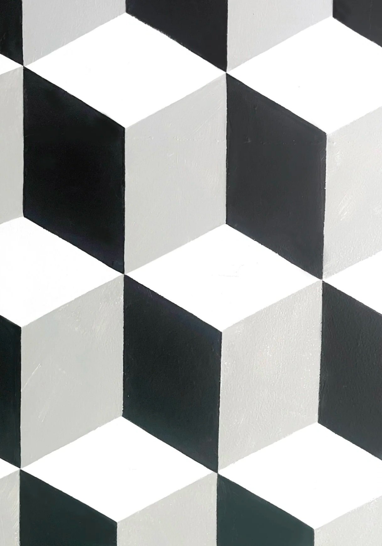 A modular wall graphic applied directly to the surface. While the geometry remains precise, the hand-painted approach introduces subtle variation and human touch—similar to a fresco.