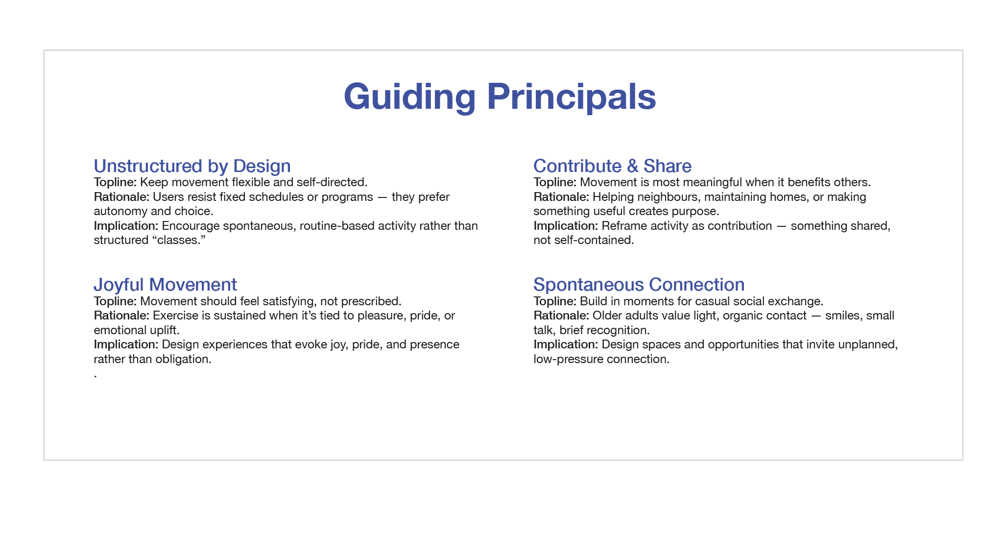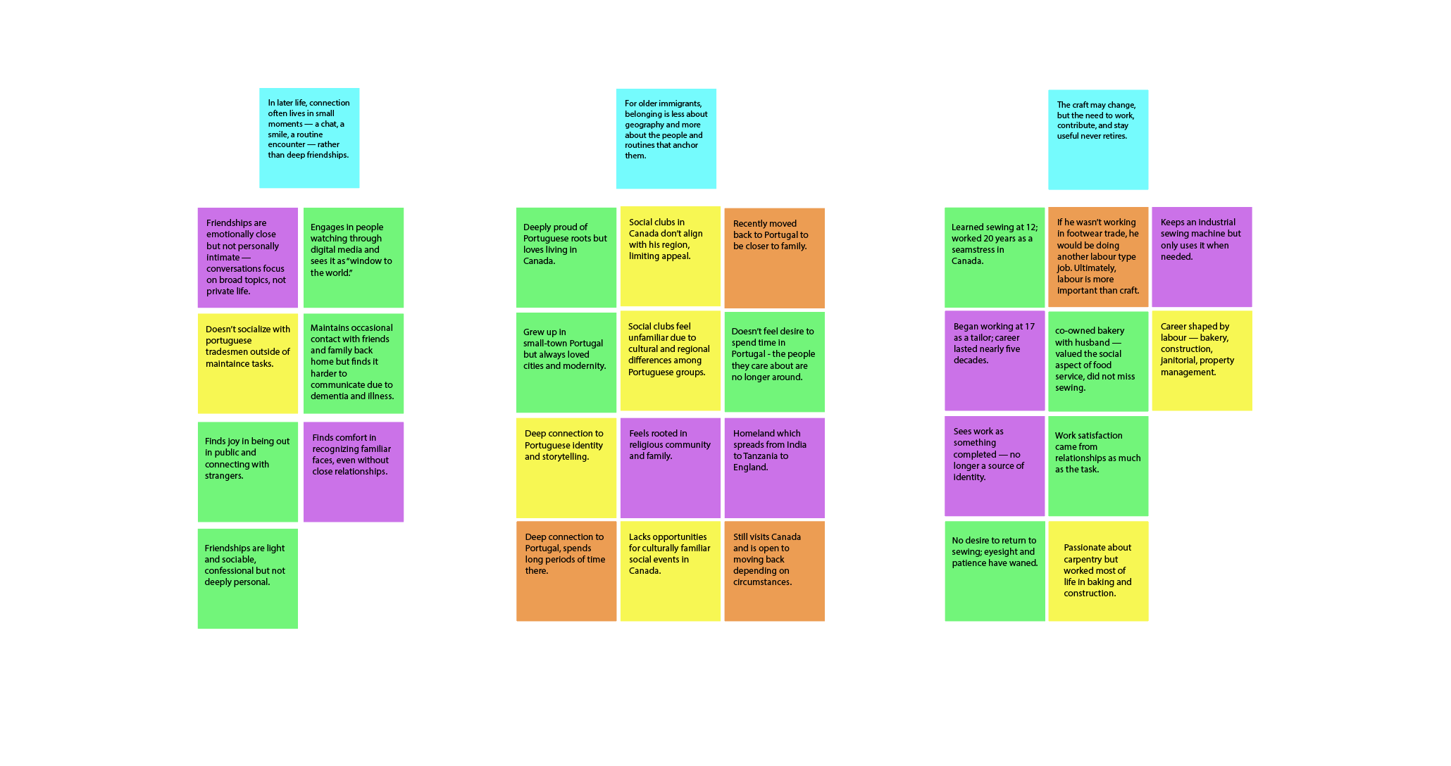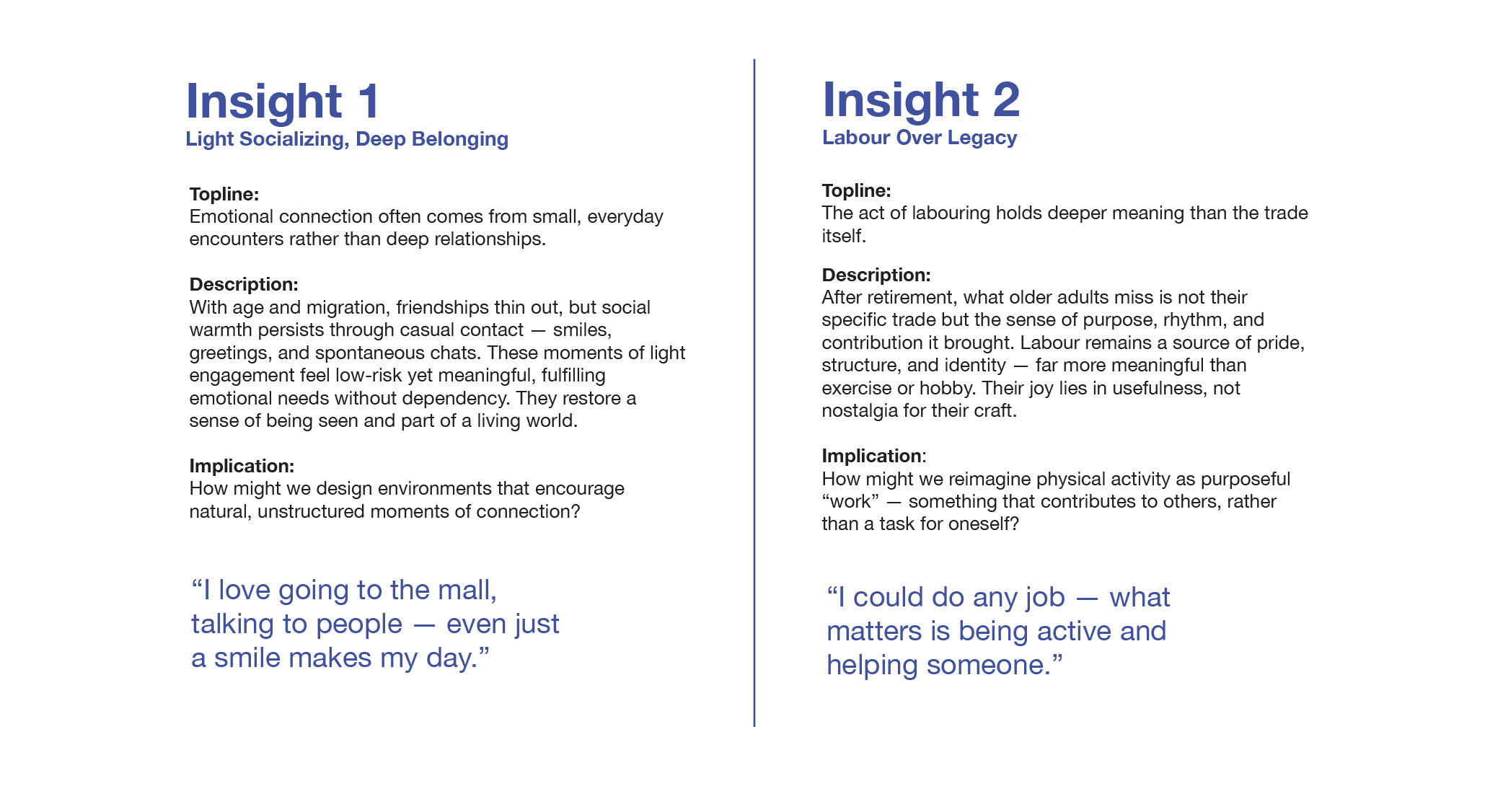 Interview notes and field observations were clustered to surface recurring patterns around movement, autonomy, language confidence, and light social interaction. This synthesis revealed that informal, self-directed activity—not structured programs—was central to how older immigrant adults stay connected and well.