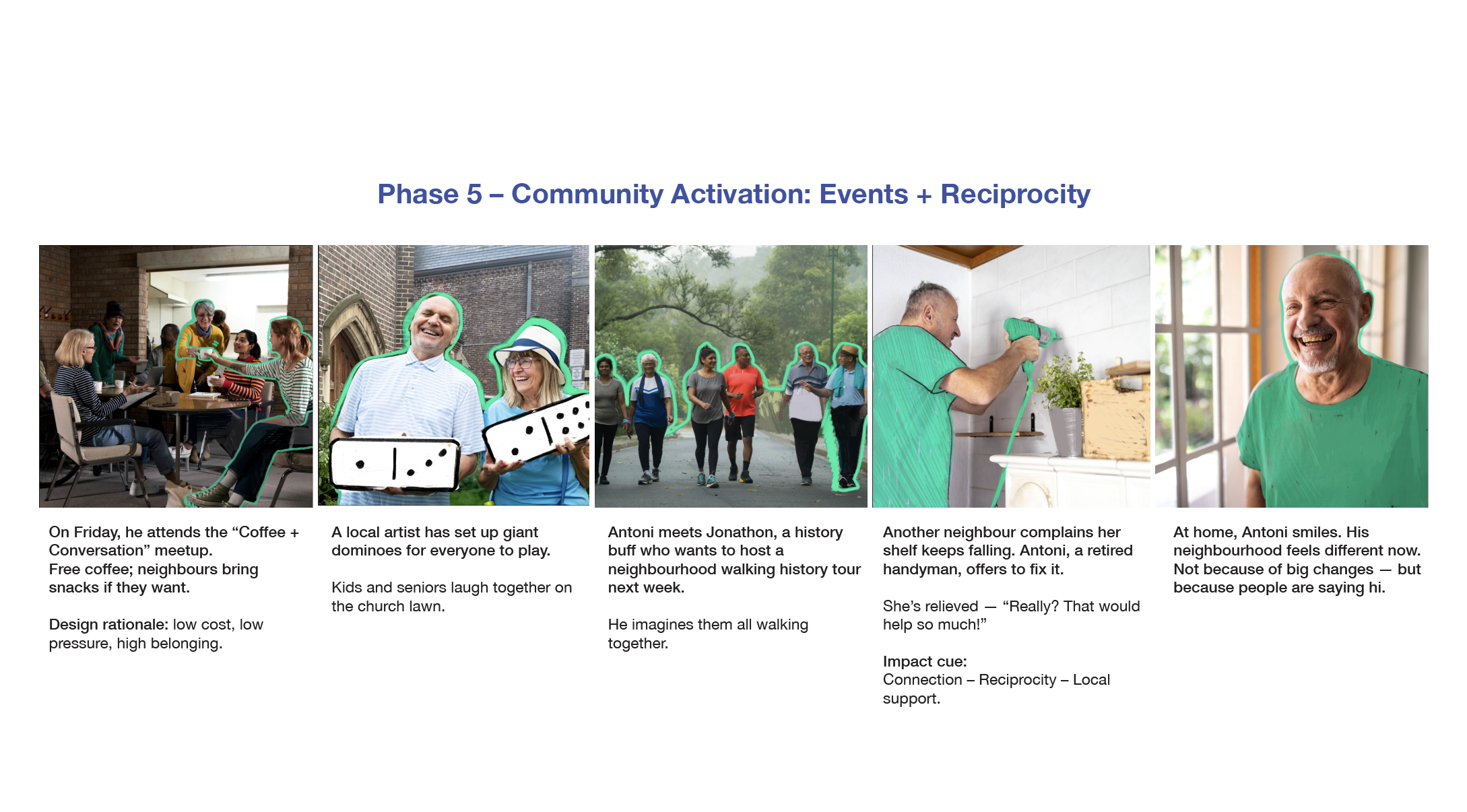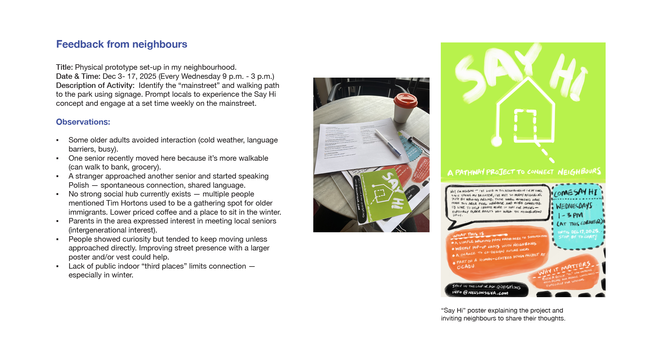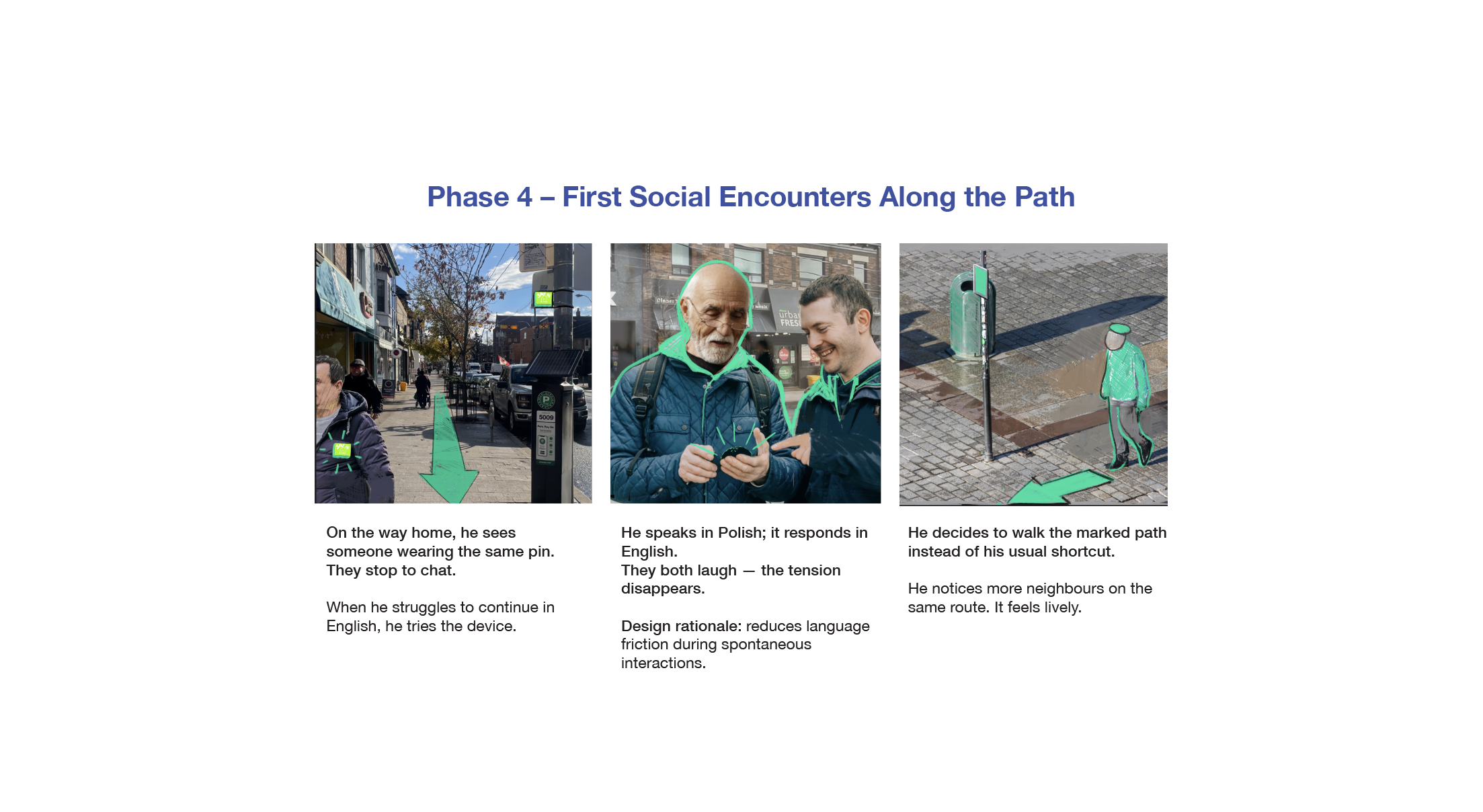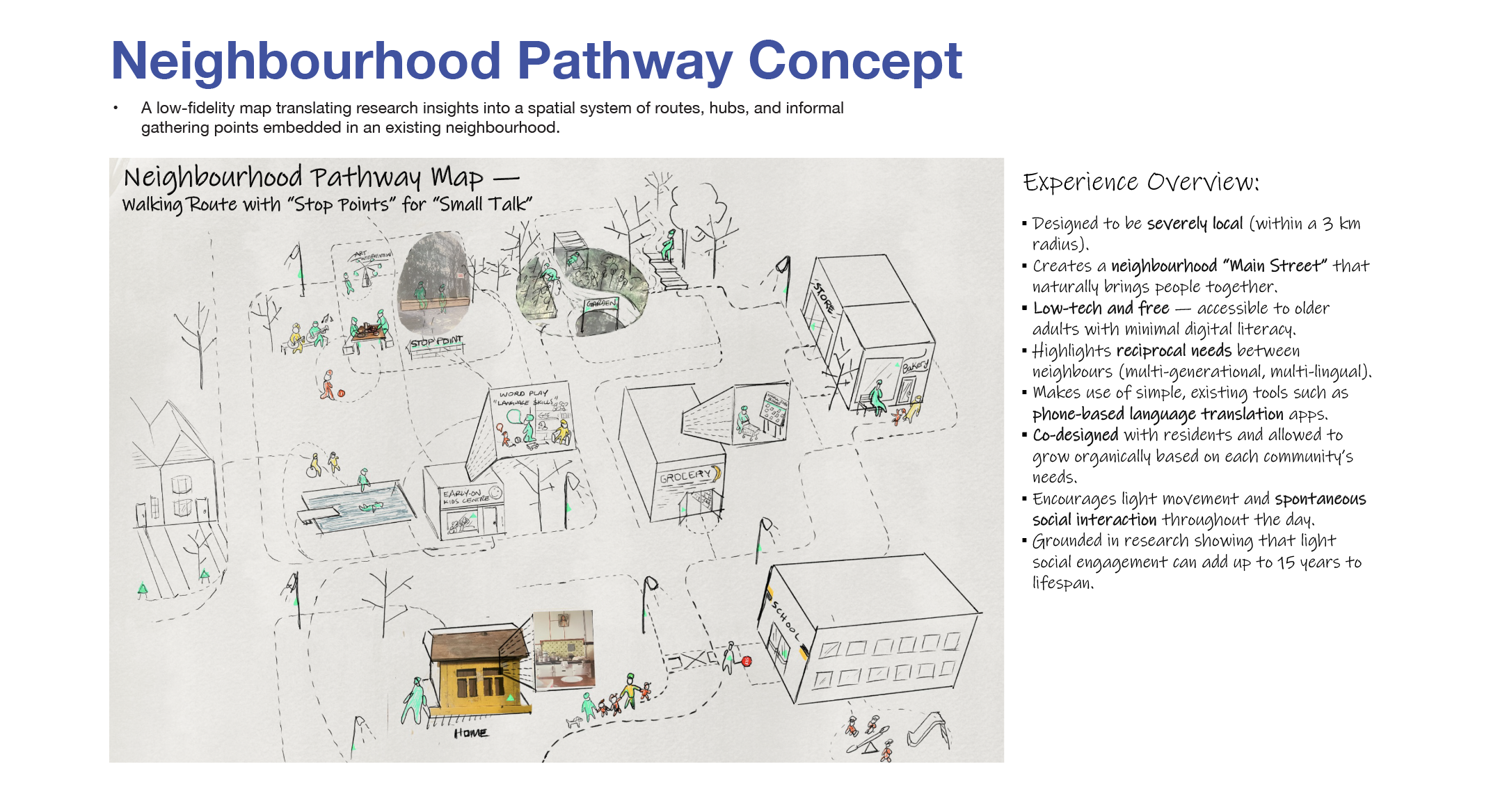 This project reshaped my understanding of social connection in later life—from something to be designed and programmed into something that must remain light, optional, and self-directed. Through street-level testing, I learned that the most impactful interventions are not polished tools but predictable places, gentle nudges, and environments that reduce hesitation to say hi. Moving forward, the work invites deeper research into how these pathways scale across different neighbourhood densities, how winter and indoor spaces can support the same warmth, and how communities can co-design their own versions over time.