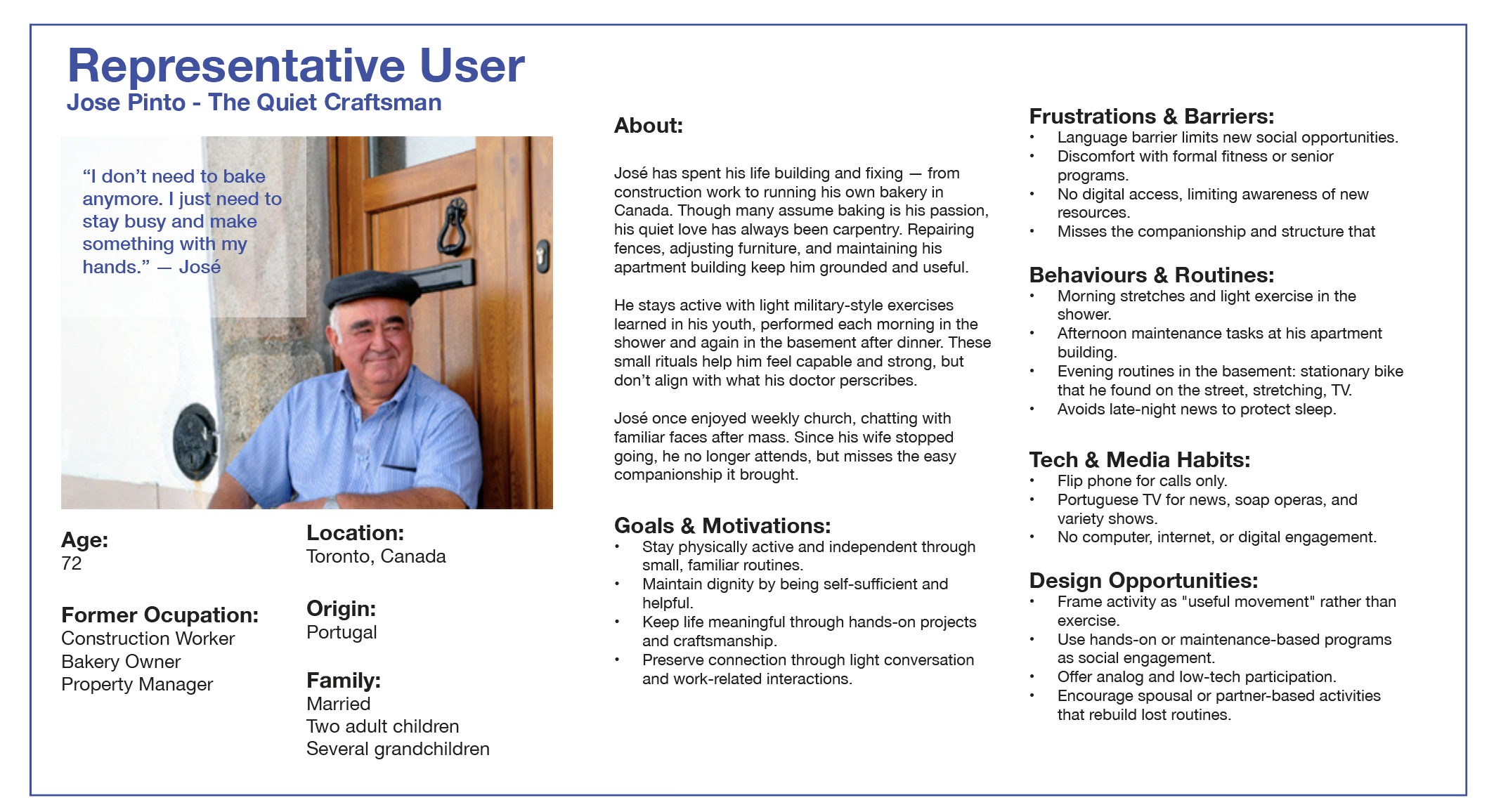 Older adults, especially those from immigrant backgrounds or physically demanding careers need a way to stay active through familiar, meaningful, and culturally relevant activities, so that they can maintain their health, independence, and sense of purpose, without relying on intimidating or unfamiliar fitness programs.