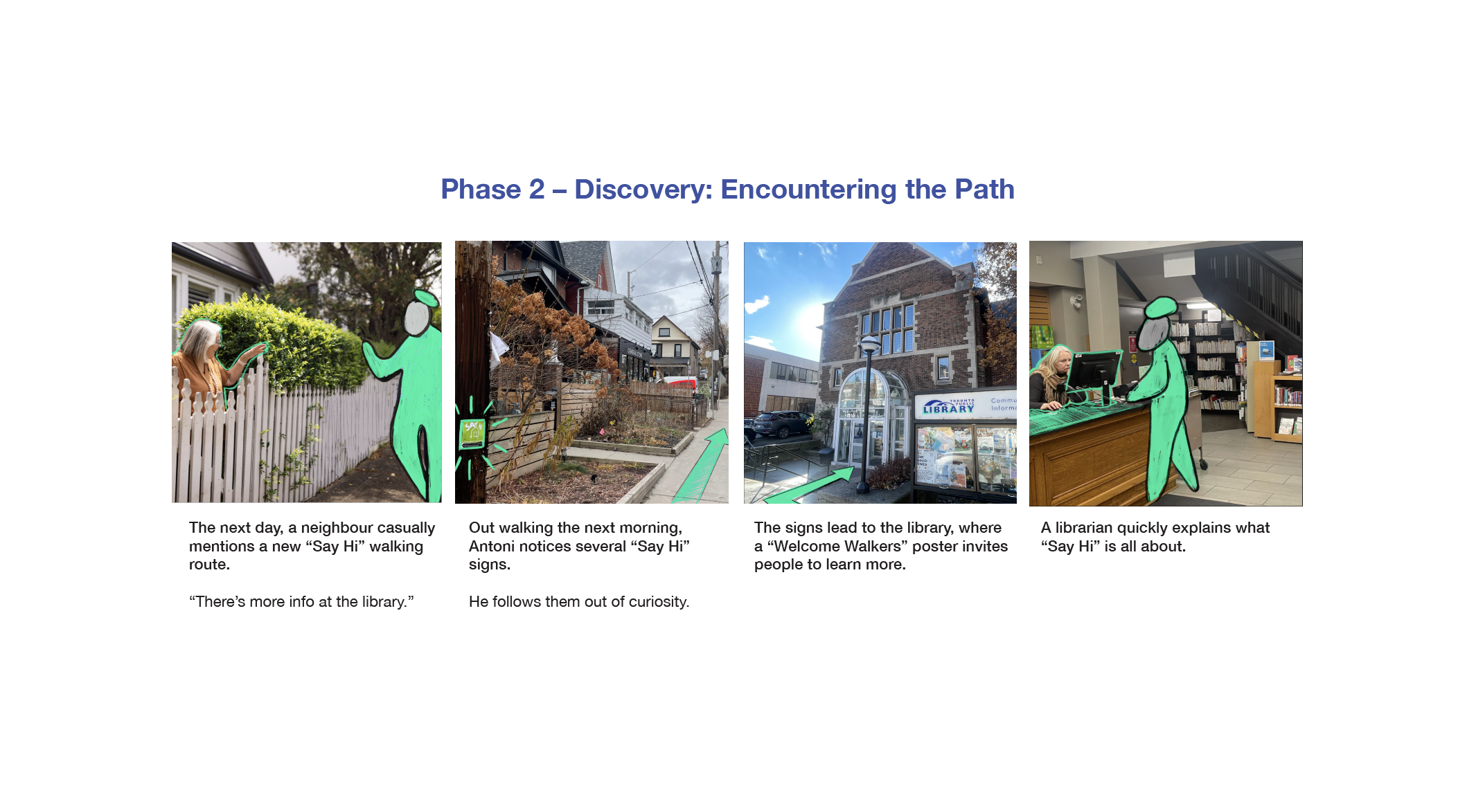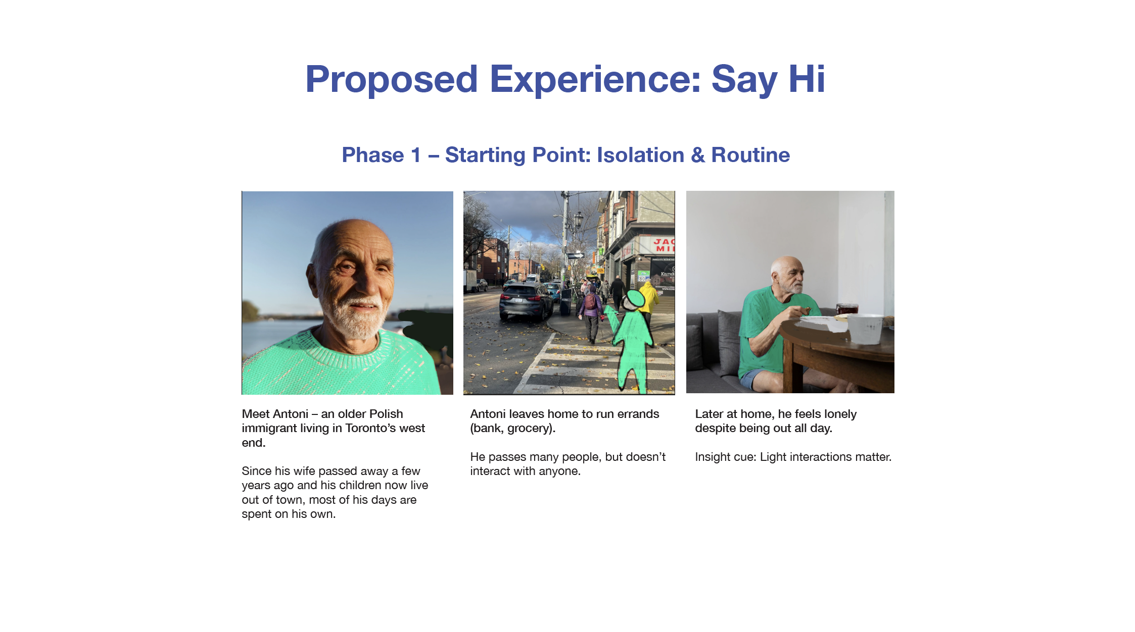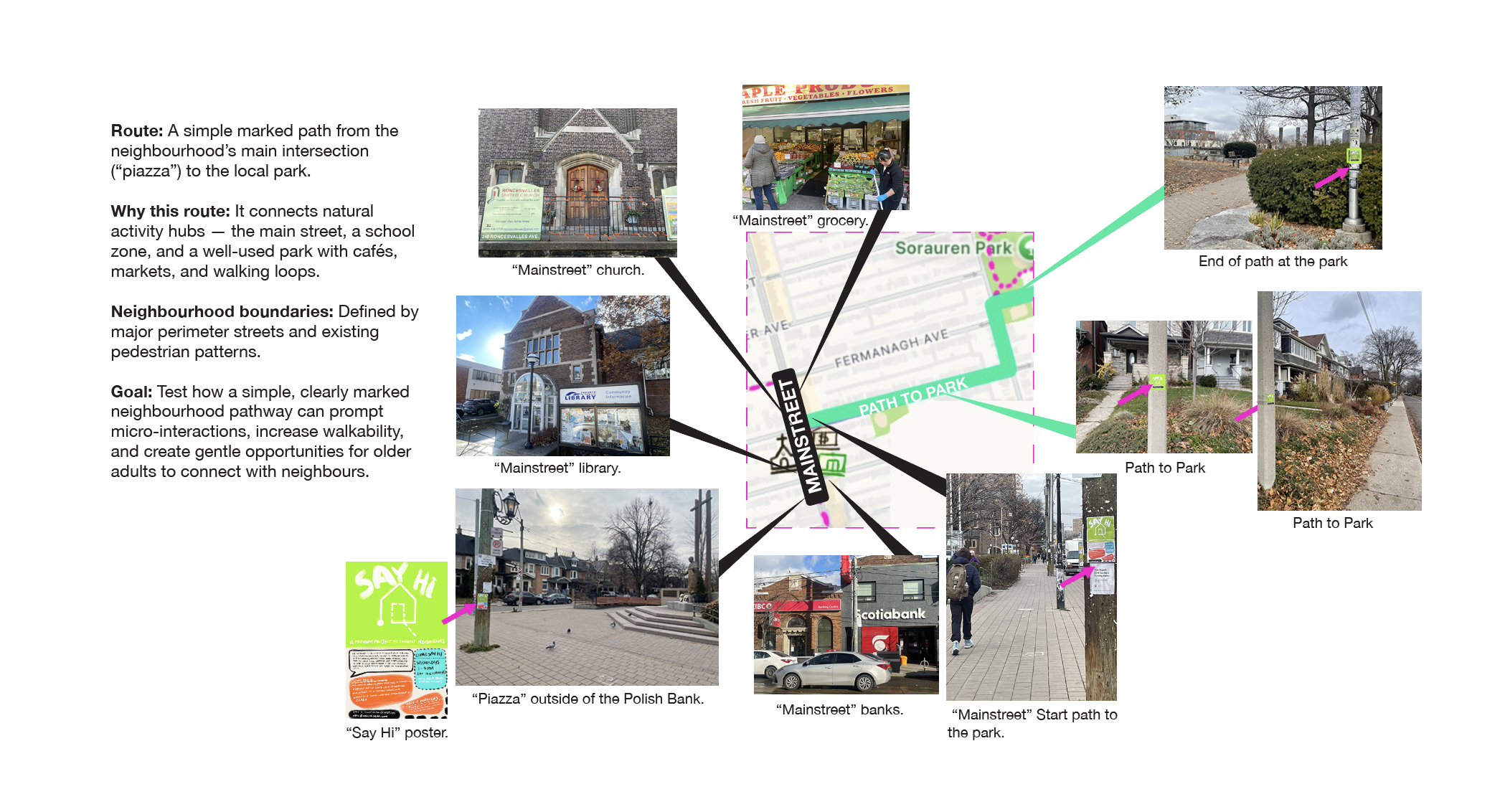 I designed and tested a low-tech, hyper-local neighbourhood activation to support older immigrant adults in staying socially connected and physically active. Grounded in human-centred design research, the project reimagines everyday walking as a social infrastructure through marked paths, informal gathering points, and lightweight tools like pins, signage, and offline translation devices. Through in-person prototyping, interviews, and street-level testing, the work demonstrates how small, unstructured interactions—“just saying hi”—can build trust, reduce isolation, and turn neighbourhoods into living ecosystems of movement, contribution, and care.