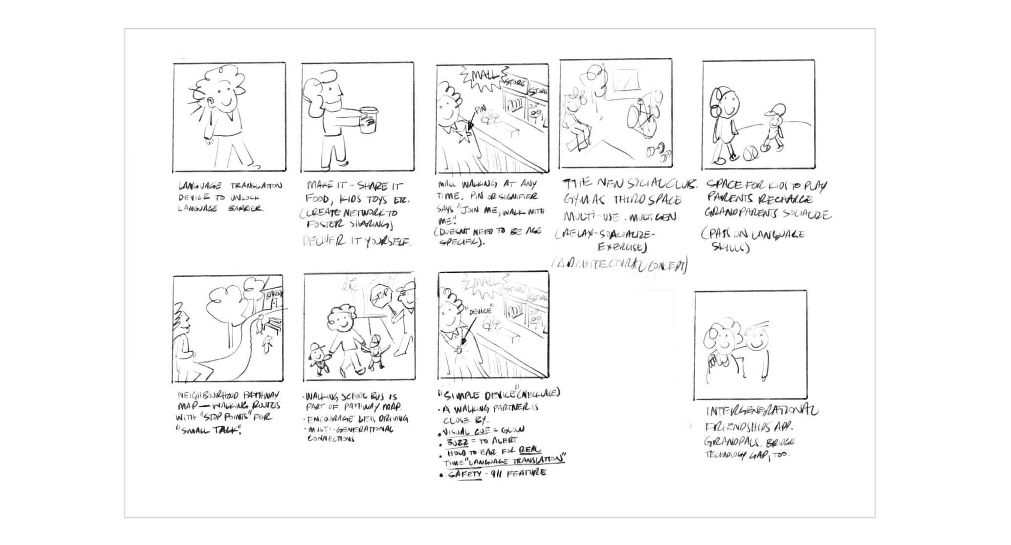 Rapid sketches exploring how walking, signage, and informal social cues could prompt movement and connection without formal programming.