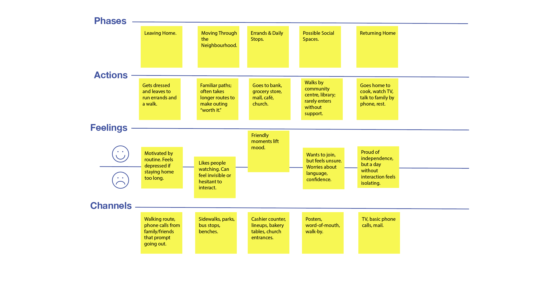 This journey map traces how an older immigrant adult moves from isolation to connection over the course of a typical day. Mapping actions, emotions, and touchpoints helped identify where small prompts—signage, social cues, and informal invitations—could naturally encourage movement and interaction without disrupting existing routines.
